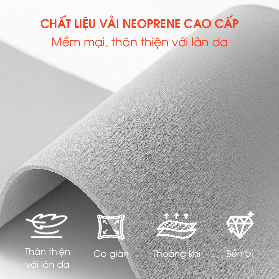 Chất liệu vải Neoprene cao cấp: Vải mềm mại, co giãn tốt, thoáng khí và bền bỉ, không gây bí nóng hay kích ứng da khi sử dụng trong thời gian dài.