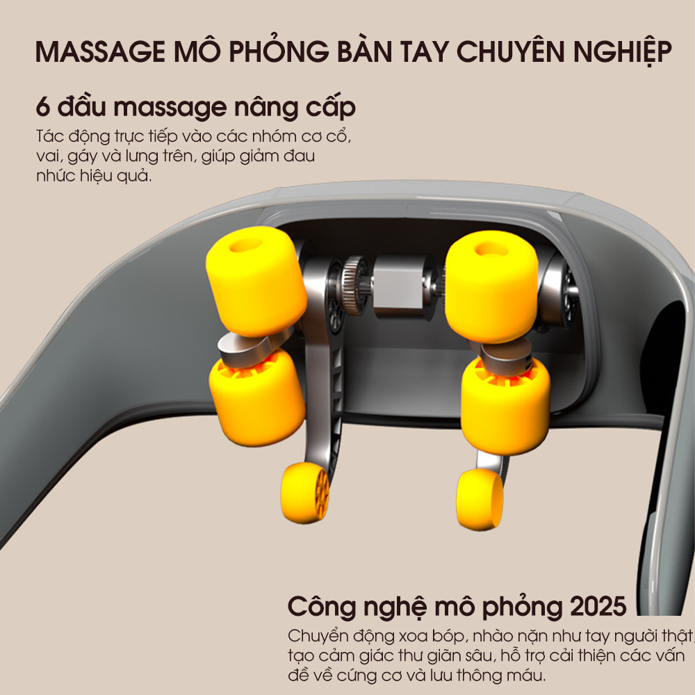 Rowanto MVG6 được trang bị hệ thống 6 đầu massage xoay đa chiều, mô phỏng thao tác xoa bóp của bàn tay con người. Các đầu massage tác động trực tiếp vào vùng cổ, vai và gáy, giúp làm mềm cơ, giải tỏa căng cứng nhanh chóng.