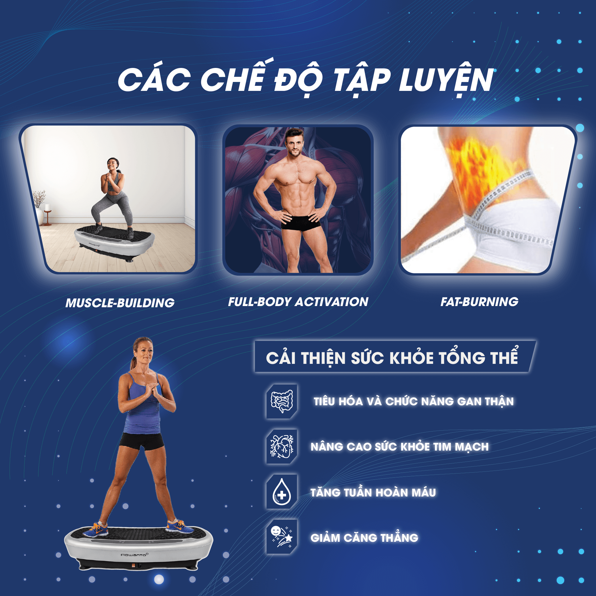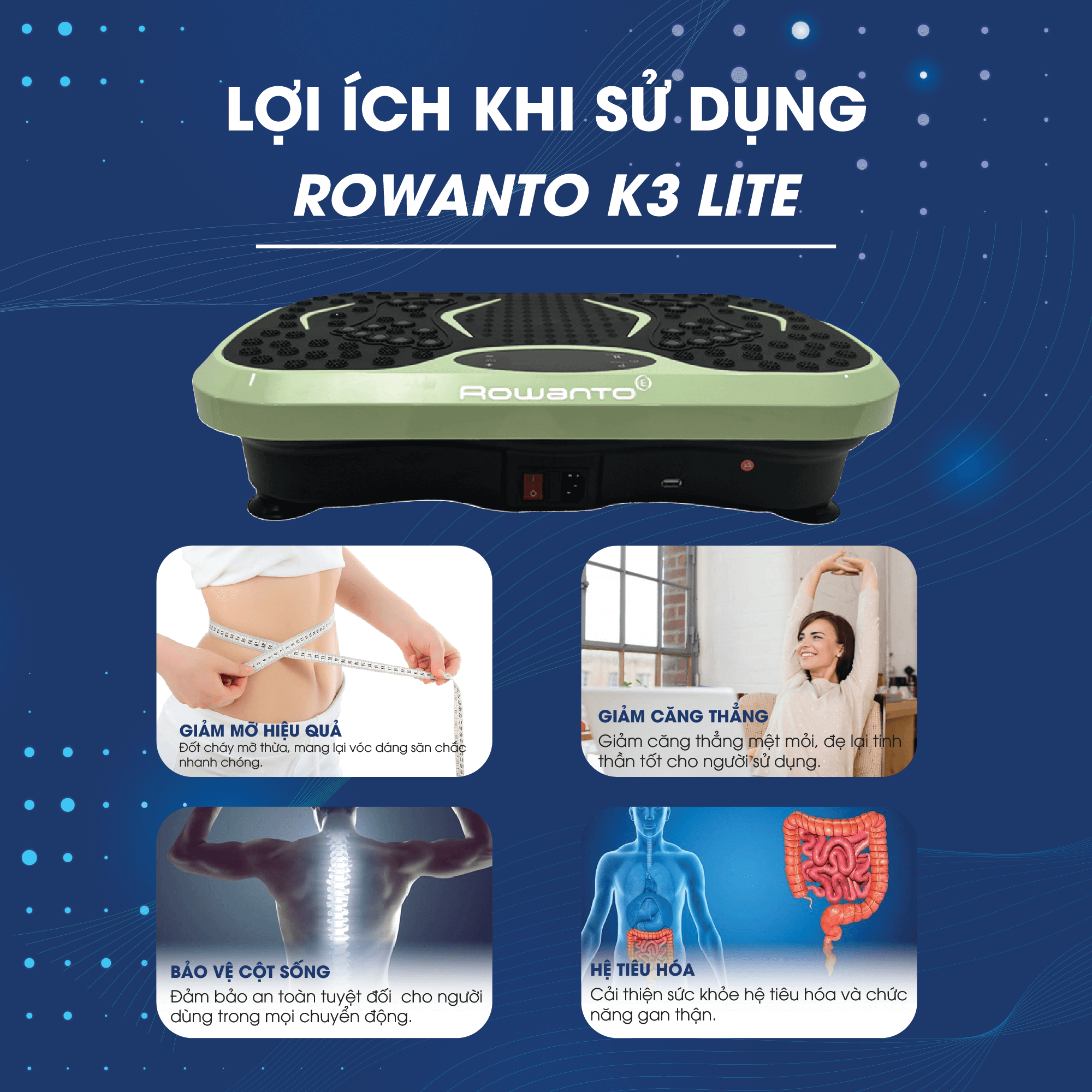 Trong nhịp sống hiện đại, không phải ai cũng có thời gian đến phòng gym mỗi ngày. Máy rung thể hình Rowanto K3 Lite ra đời như một giải pháp tập luyện thông minh, giúp kích hoạt cơ bắp, hỗ trợ đốt mỡ và thư giãn cơ thể chỉ trong thời gian ngắn. Thiết kế gọn gàng, công nghệ rung tiên tiến cùng nhiều chế độ tập luyện giúp người dùng dễ dàng duy trì thói quen vận động khoa học ngay tại nhà.