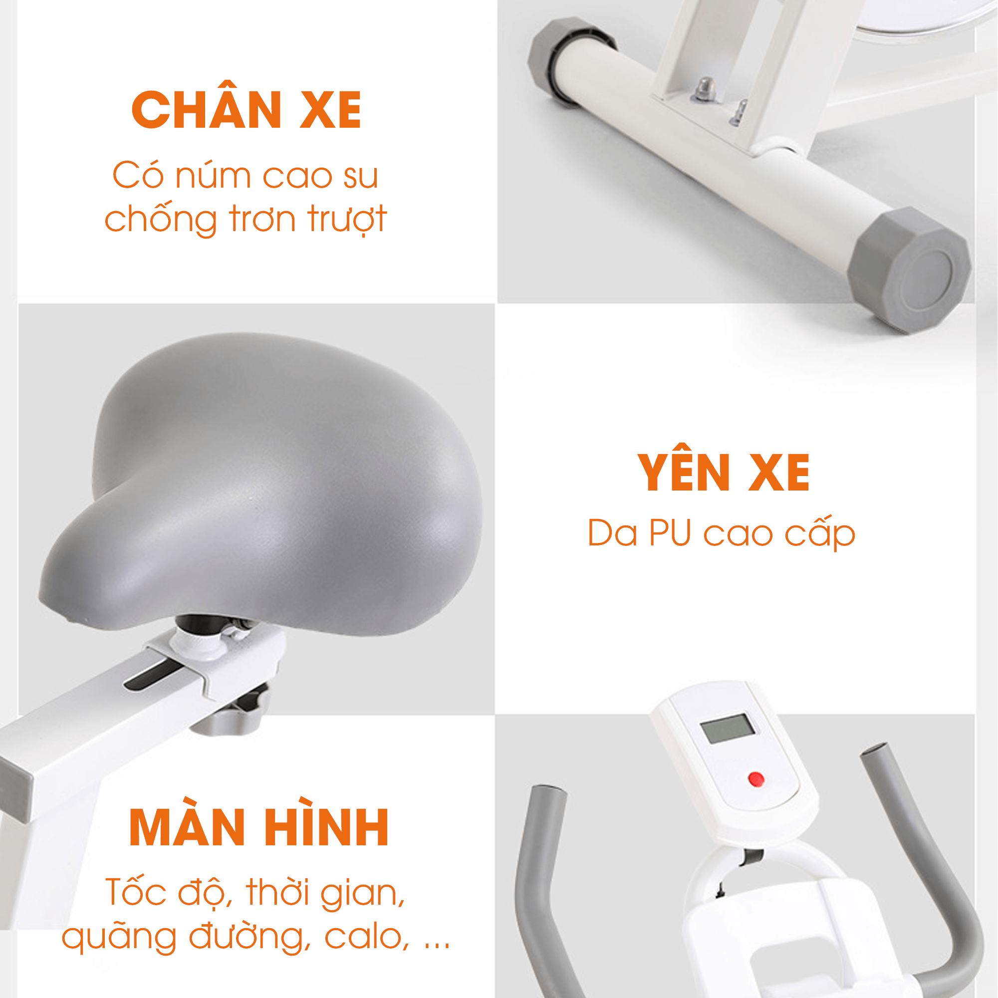 Tay cầm bọc chống trượt, tạo cảm giác an toàn, hỗ trợ tư thế ngồi đúng và ổn định khi tập luyện.